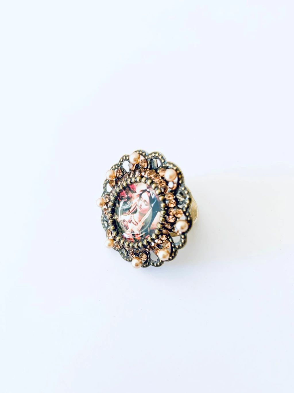 * Anel aro flexivel delicado com imagem de Nossa Senhora da Misericóridia e strass dourado.