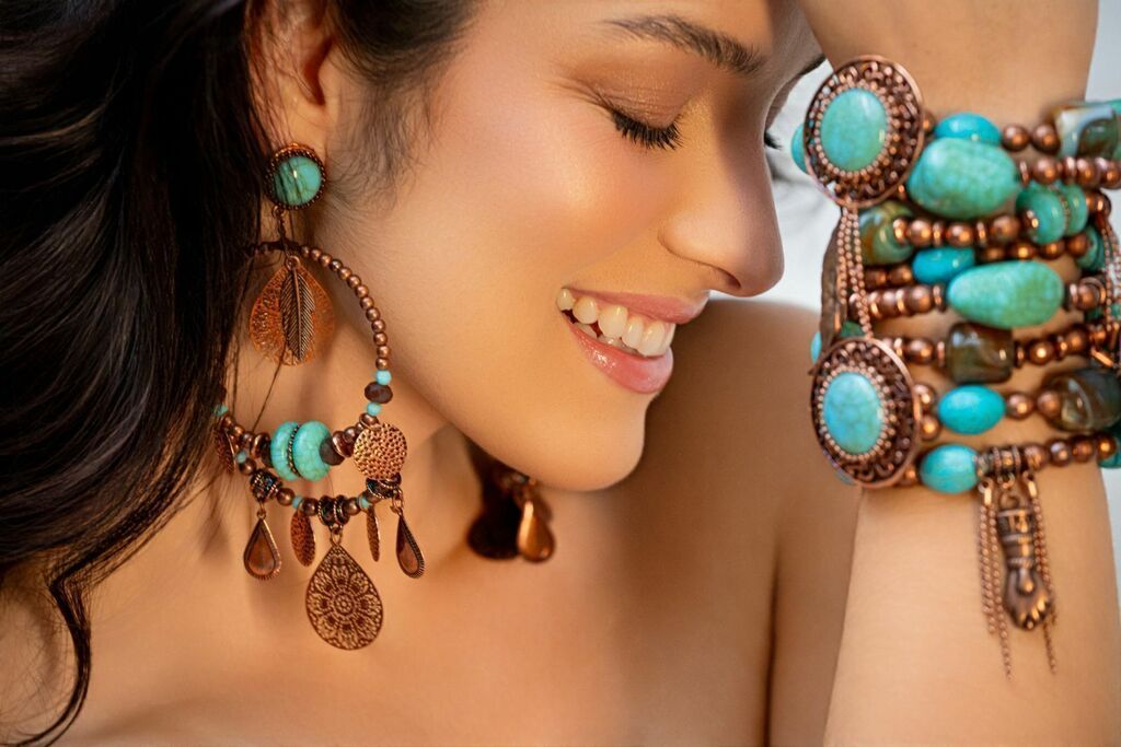 * Argola com bolinhas no cobre velho, pedras turquesa e detalhes em medalhas trabalhadas caídas.