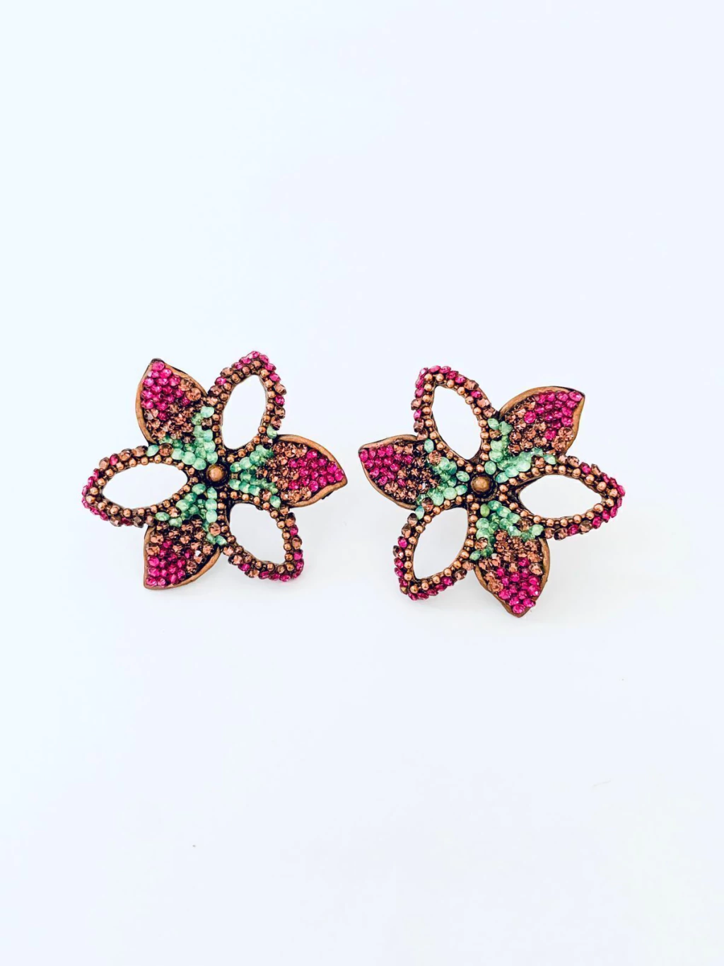 * Brinco delicado de flor com strass verde menta, fucsia e lilás.