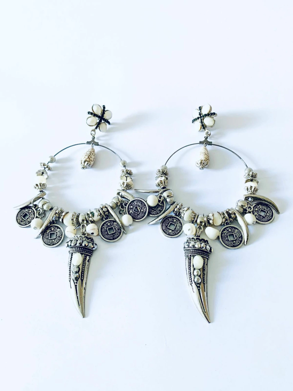 * Brincos com pingentes prata, dentes caídos e detalhes em madri pérolas .