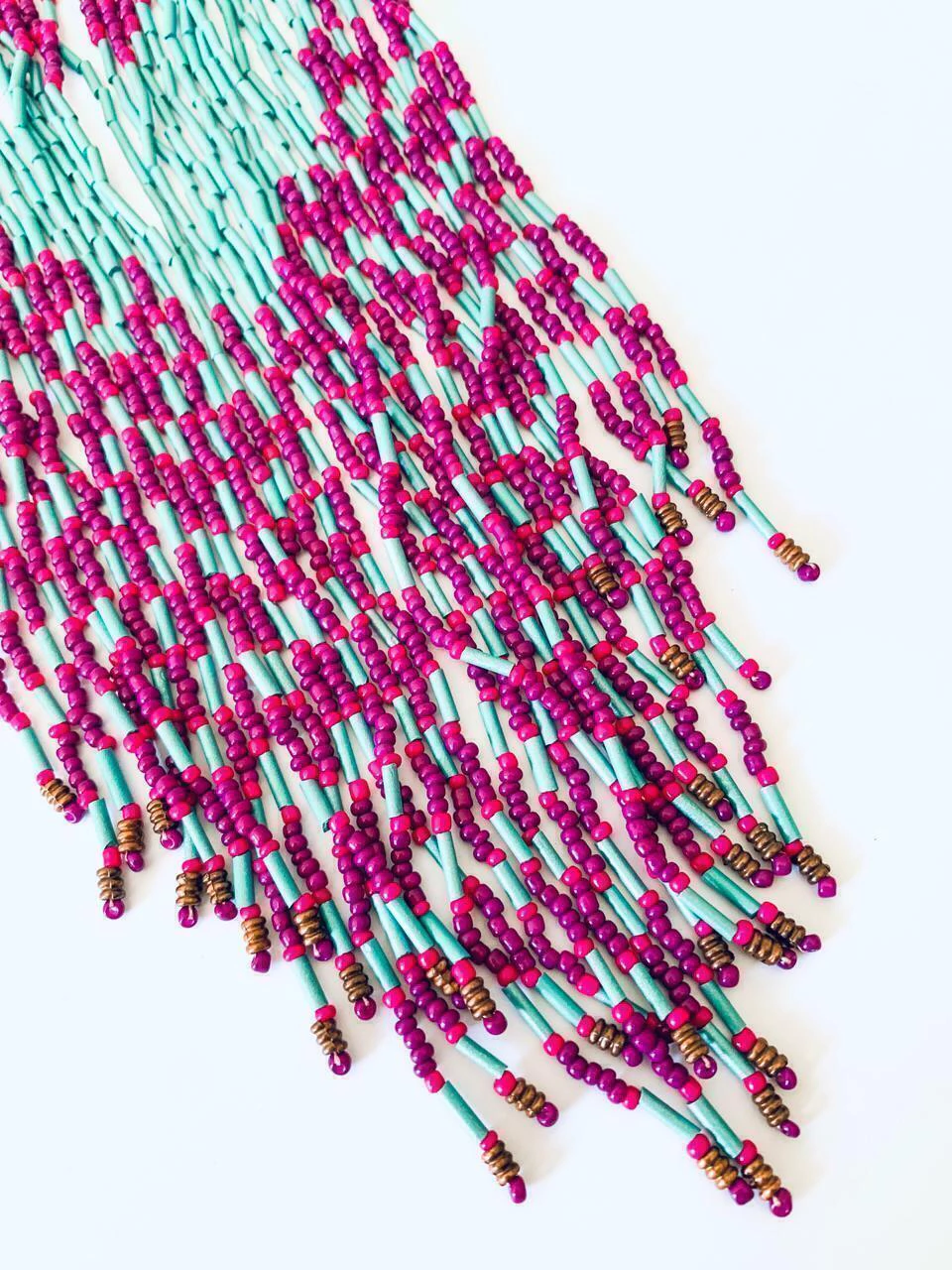 * Colar com franjas caídas em canutilhos rosa, roxo e azul, com detalhes em pedras redondas azul leitosa e pink.