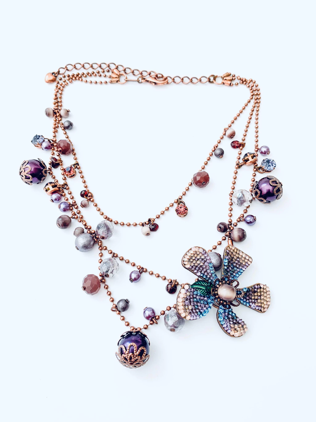COLAR EM CAMADAS COM DETALHES EM PÉROLAS E CRISTAIS PENDURADOS, COM DETALHE EM FLOR  NOS TONS ROSA CLARO, LILÁS, AZUL E VIOLETA