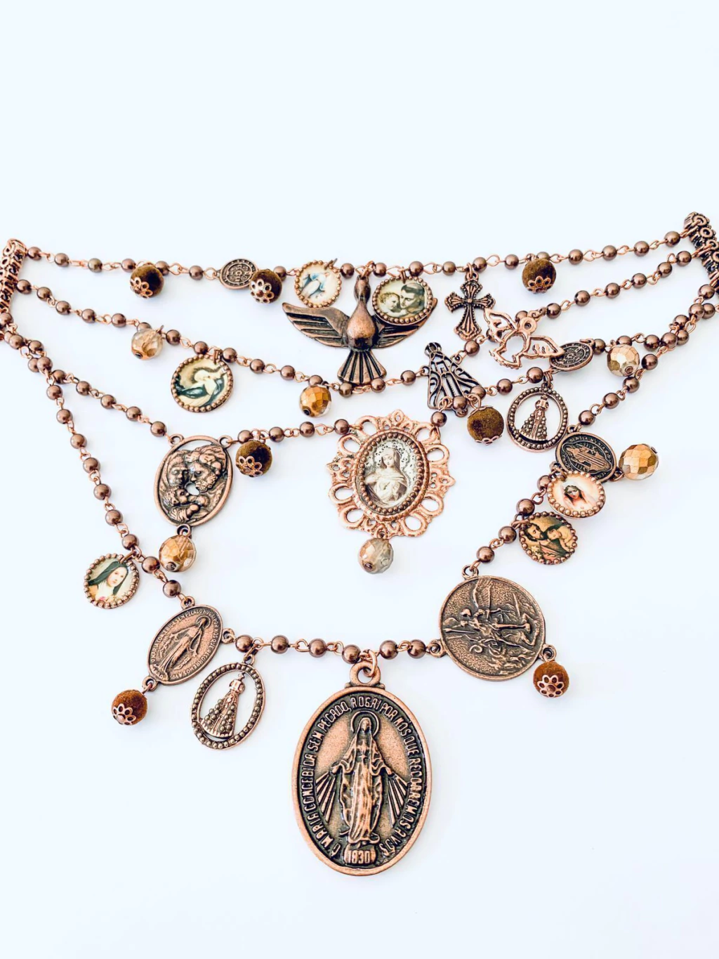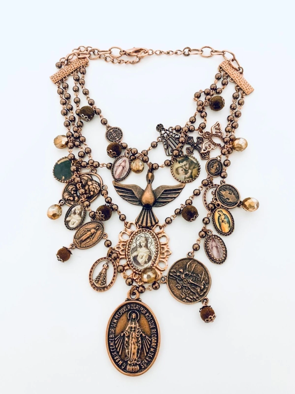 COLAR COM DETALHES EM PINGENTES SANTOS E CRISTAIS NO TOM CHÁ