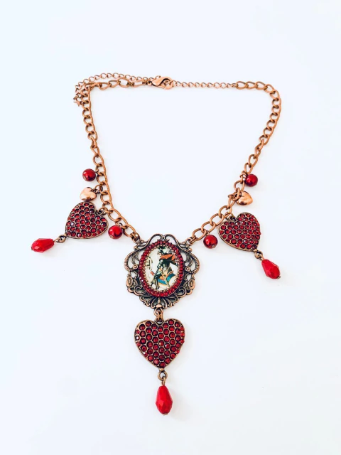* Colar delicado com medalha de São Jorge e detalhes em pingentes de coração em strass vermelho.