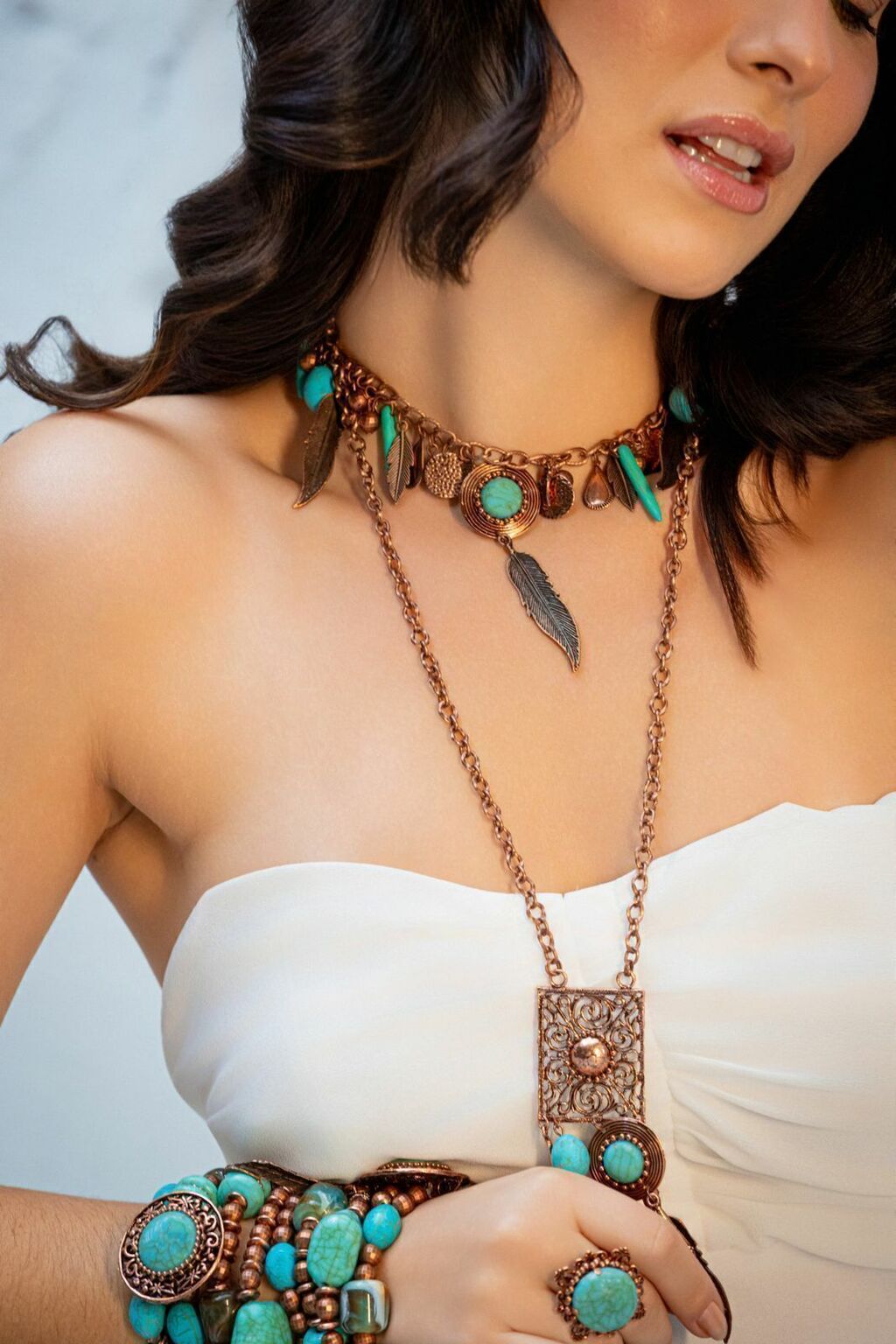 * Colar duplo com choker com pingentes de folinhas e pedras turquesas caída e colar comprido com pingentes de pena, medalhas com detalhes em pedras turquesa.
